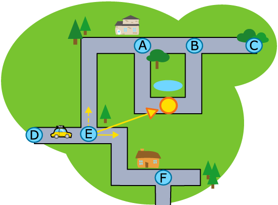 舉例來說,下圖中計程車要前往黃色圓圈的位置,當計程車沿著路走到達標示為E的路口時,它有兩個選擇:直走 (實線箭頭) 或左轉 (虛線箭頭) 。當計程車比較實線箭頭和虛線箭頭與黃色圓圈的夾角時,可以發現實線箭頭與黃色圓圈所形成的夾角較小,因此計程車會選擇直走前進。